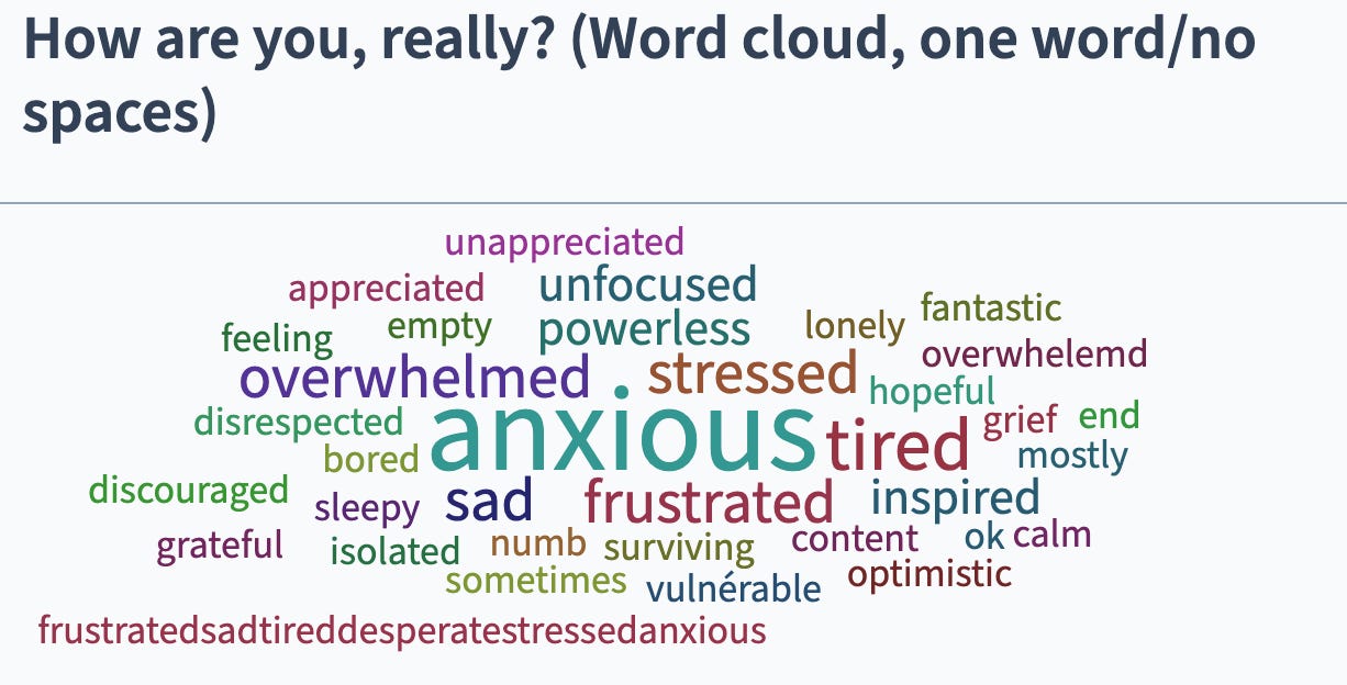 This word cloud is what I heard running a program for a small leadership group earlier this week. The “frustratedsadtireddesperatestressedanxious” came on the screen, and the whole room spoke up in agreement. Yes! That! There was a glorious exhale: I am not alone in this struggle. There is nothing wrong with me for feeling the way I do. I make sense. This feels hard, because it is.